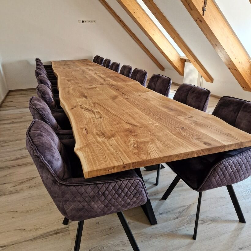 In Büros und Konferenzräumen stehen massive Tischplatten aus Eiche für Professionalität und Stabilität. Die klare Linienführung und das zeitlose Design eines Eichentisches schaffen eine inspirierende Arbeitsumgebung, in der Kreativität und Produktivität gefördert werden. Darüber hinaus strahlt ein Eichentisch Seriosität und Vertrauen aus, was ihn zu einer idealen Wahl für geschäftliche Besprechungen und Präsentationen macht. Besonders ausdrucksstark und selbstbewusst sind unsere Eichentische mit Baumkanten. Der individuelle Baumkantenverlauf verleiht ihnen eine einzigartige Ausstrahlung, die gleichzeitig nutzungsorientiert und elegant ist. Ein Konferenztisch aus Altholz hebt ihre Personal- und Geschäftsbesprechungen mit seiner authentischen und starken Ausstrahlung auf ein neues Level.