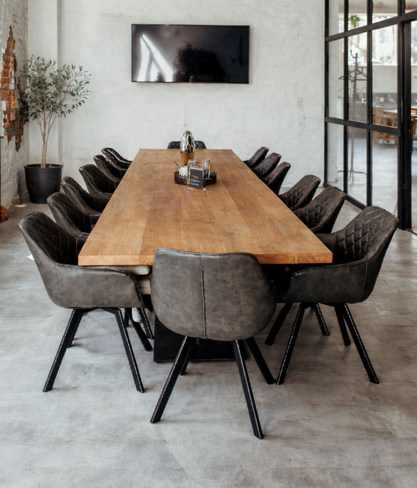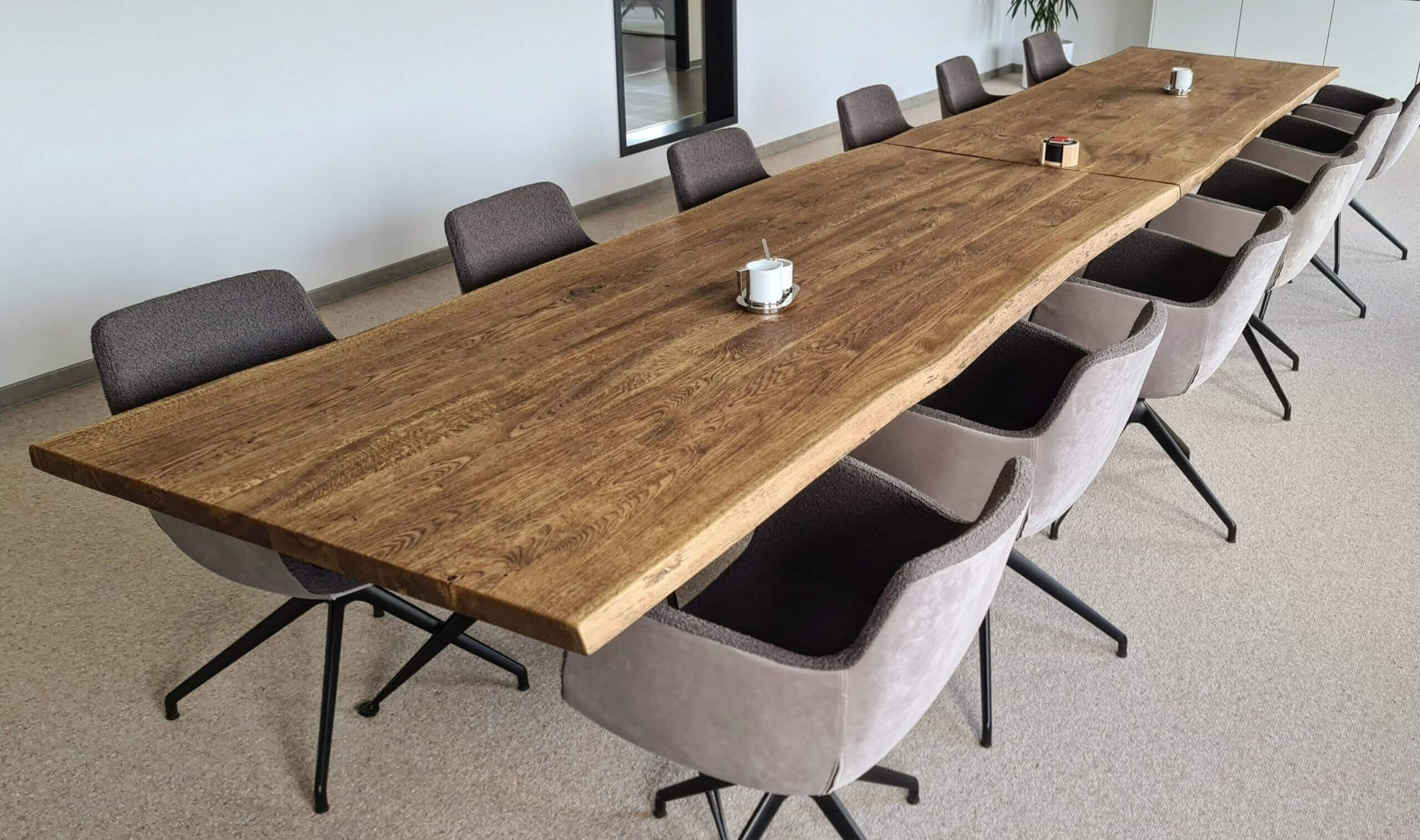 Selbstverständlich sind Konferenztische auch ohne Höhenverstellung eine hochwertige und bewährte Lösung. Gerade bei feststehenden Modellen steht das Material Massivholz im Mittelpunkt: Eine vollmassive Tischplatte aus Eiche überzeugt durch ihre natürliche Ausstrahlung, Langlebigkeit und repräsentative Wirkung und schafft eine ruhige, wertige Atmosphäre für konzentrierte Besprechungen und strategische Gespräche.