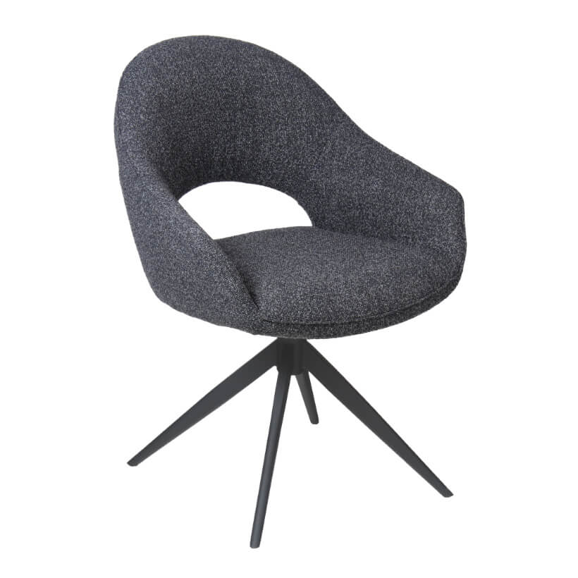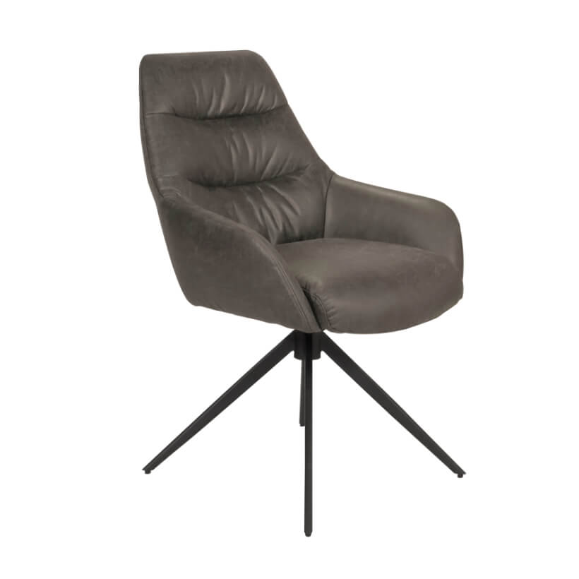 Elegant, dezent und einfach schick. Stuhl Chris ist einzigartig im Design und ebenfalls mit der beliebten Drehfunktion (360° drehbar) versehen. Neben zwei Farbvarianten in einem robusten Cario Stoff gibt es diese Variante auch in Dark Grey in Lederoptik. Dieses Modell ist sowohl ein wunderschöner Esszimmerstuhl als auch perfekt für den Einsatz im Konferenzraum